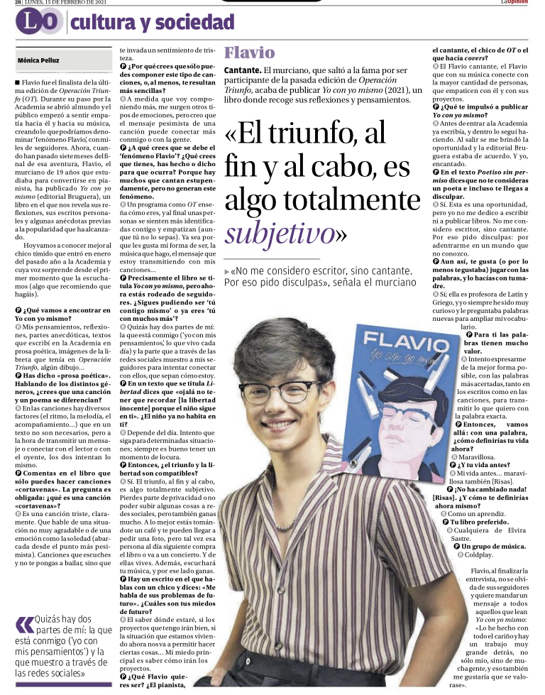 Un día se me ocurrió publicar en Twitter que volvía a las entrevistas y que lo hacía con una persona un tanto especial: Flavio, el finalista de la última edición de Operación Triunfo. En ese momento, gracias a diversas interacciones a través de dicha red social, conocí a los seguidores del murciano y empecé a darme cuenta del fenómeno que había detrás del cantante. Así que afronté la entrevista con ganas y nervios, por la repercusión que pudiera tener. Sin embargo, nada más descolgar el teléfono, una voz grave y amigable me respondió con naturalidad y los nervios se transformaron en una charla divertida y con muchas risas.